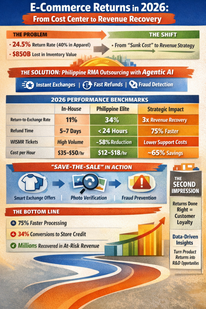 - The Solution: Specialized ecommerce returns & RMA management outsourcing Philippines that uses Agentic AI to convert 34% of return requests into exchanges or store credit instantly.